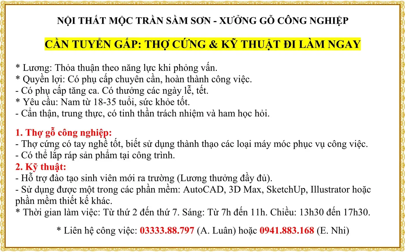 XƯỞNG NỘI THẤT MỘC TRẦN cần tuyển thợ gỗ công nghiệp đi làm ngay.
