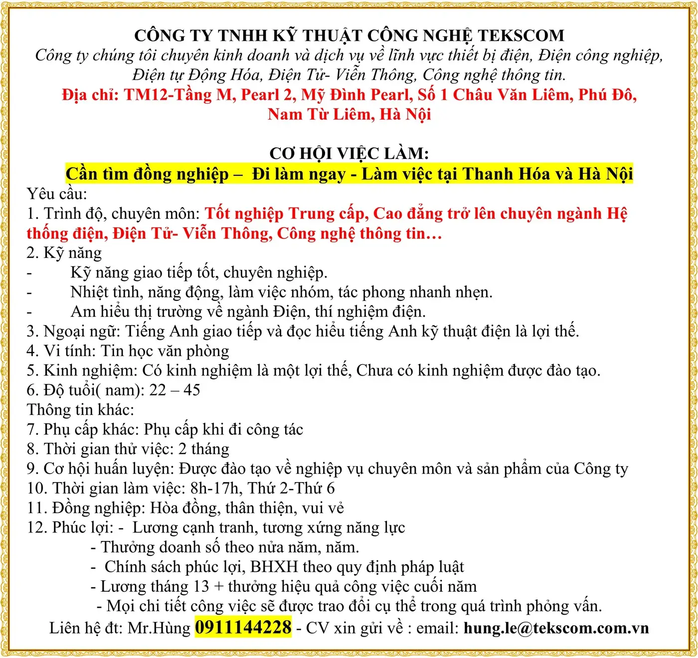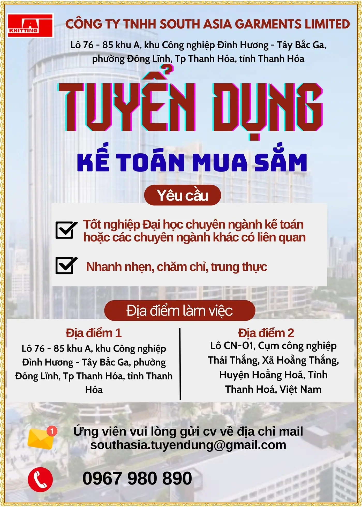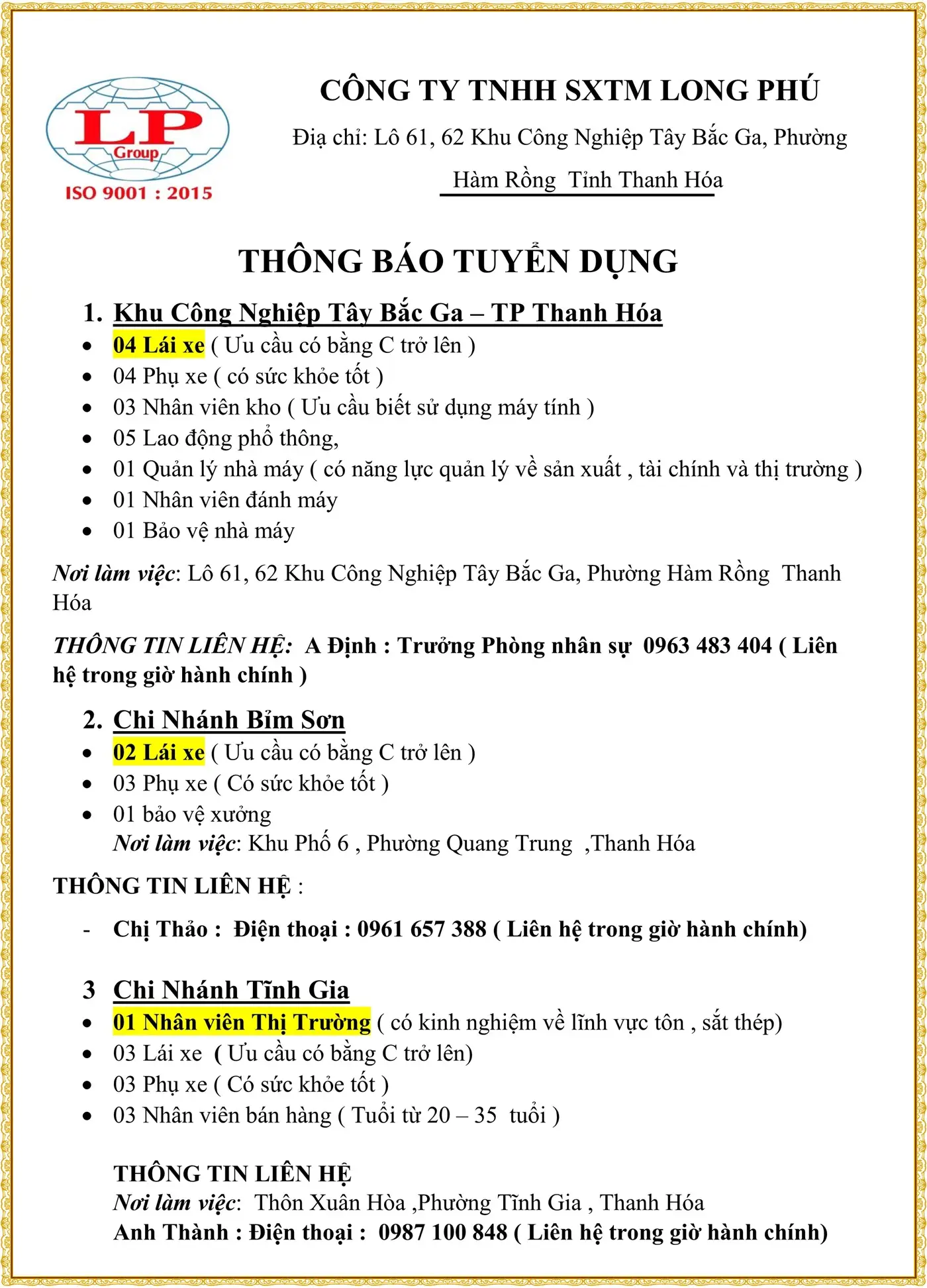 - Địa điềm làm việc: Lô 38, Khu CN Tây Bắc Ga, Phường Hàm Rồng, Thanh Hoá. CV ứng tuyển gửi về địa chỉ mail:
