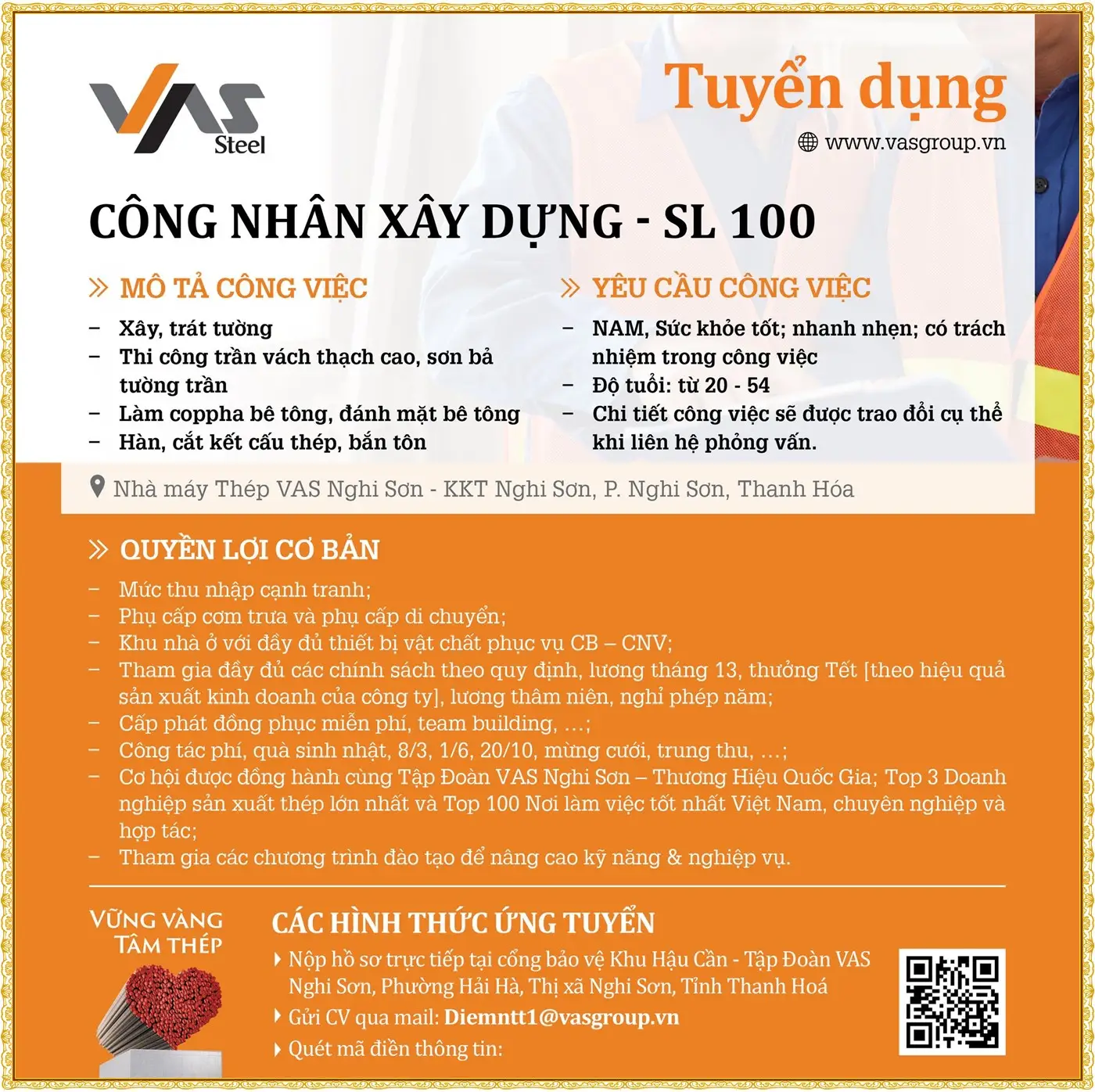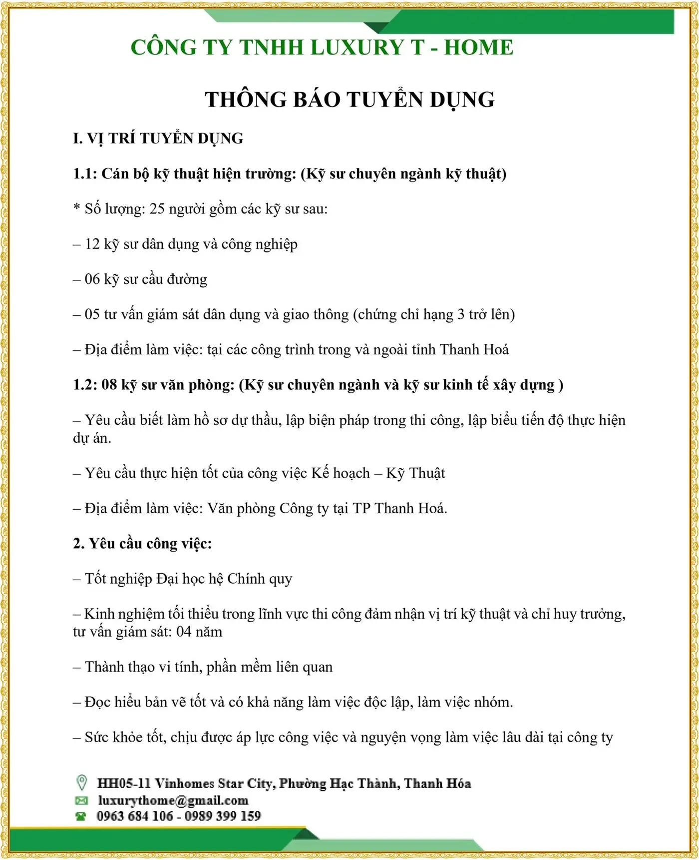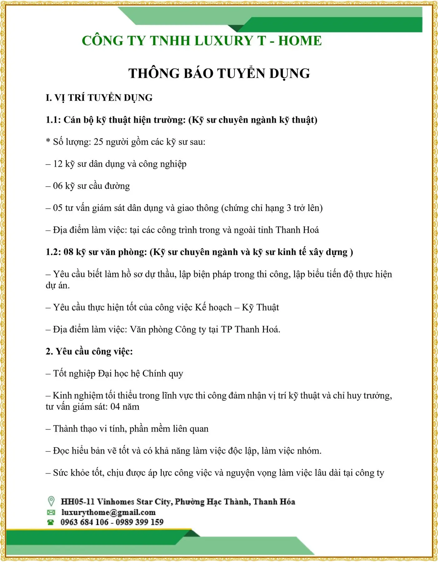 - Địa điềm làm việc: Lô 38, Khu CN Tây Bắc Ga, Phường Hàm Rồng, Thanh Hoá. CV ứng tuyển gửi về địa chỉ mail: