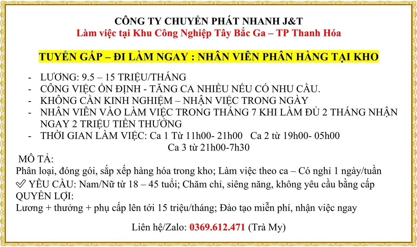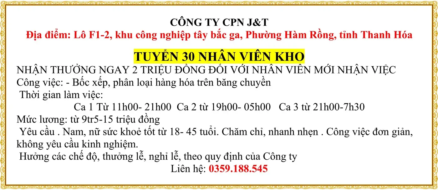 CÔNG TY CPN J&T TUYỂN 30 NHÂN VIÊN KHO